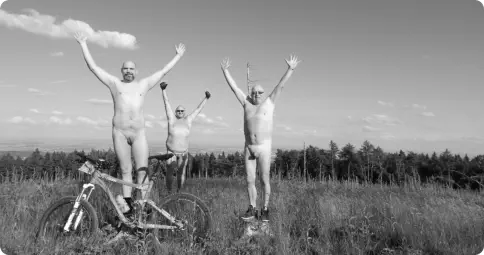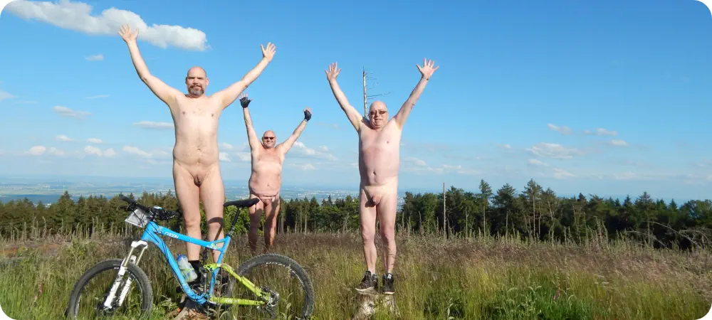 "Pure Lebensfreude! Die kommt bei mir auf, wenn ich nackt alleine oder in der Gesellschaft toller, naturistischer Freunde durch die schönen Wälder rund um den Feldberg im Taunus fahren kann.Ich fühle mich der Natur selten so nah und verbunden, fühle die Wunder, aber auch die Bedrohung durch den Menschen hautnah. Ich würde sagen, dass mich die eigene Nacktheit die Verletztlichkeit und Zerbrechlichkeit der Natur viel mehr spüren lässt und ich hier durch mehr Rücksicht und Demut vor deren Wundern nehme.Und dieses Verbundenheit ist für mich wahre Lebensfreude!“"Taunus Nackt-Mountainbike-Gruppe“. Ralf