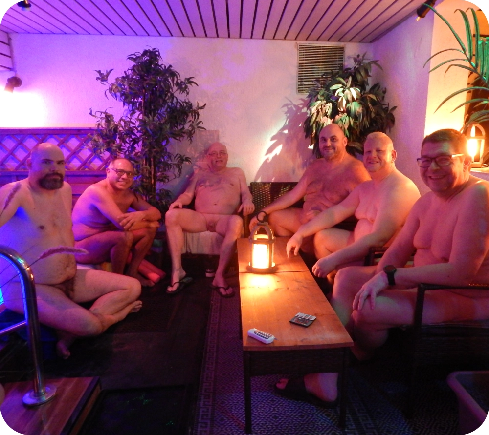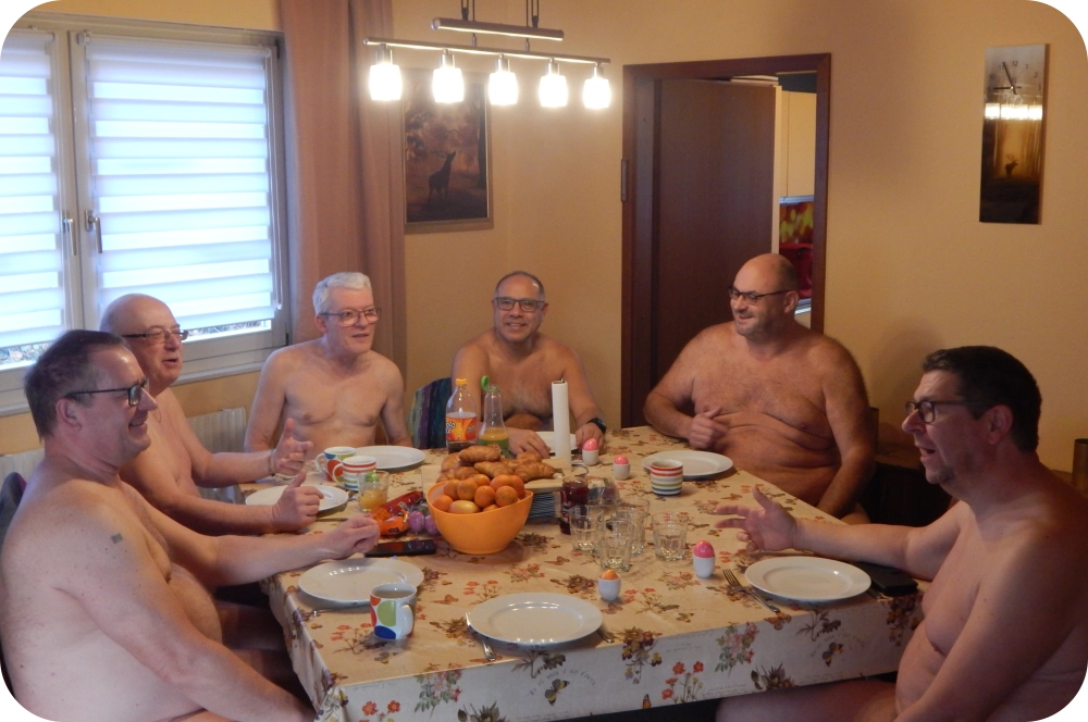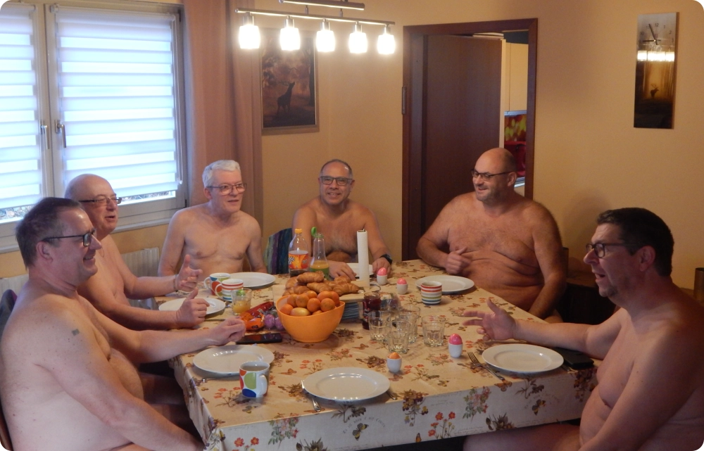 Erstes Wellness-Wochenende der Taunus-Nackt-Mountainbike-Gruppe in der Villa Wickenberg in Runkeln / Hofen am 15.-16.02.2025Nun verabredet sich die Gruppe ja schon etwas mehr als ein Jahr zu regelmäßigen Wellness-Abenden in der Villa Wickenberg und so kamen wir auf die Idee, mal ein Wochenende dort zu verbringen.Bislang stellten wir immer fest, dass die 4 Stunden, die wir im Wellnessbereich verbrachten, so schnell an uns vorbeiflogen, dass eine Verlängerung absolut Sinn machte. Steht schließlich in diesem Jahr auch das erste große Nackt-Event mit den Hessischen Naturistentagen auf dem Krackhof in Flieden an. Also hatten wir sicherlich noch so einiges zu besprechen. Aber auch an ein paar Spiele für den geselligen Abend war gedacht, wie ein Riesenmikado oder Jenga.Um 16 Uhr konnten wir das Haus beziehen und nach einer kurzen Einweisung des Vermieters hieß es dann raus aus den Klamotten und auf in den Wellnessbereich für eine erste Runde im Pool. Der erste Saunagang wurde auf die Zeit nach dem Abendessen verschoben, da wir erst einmal vergessen hatten, die Sicherung für die Sauna einzuschalten.Das Abendessen wurde uns freundlicherweise vom Vermieter der Villa geliefert, der dann auch mit uns aß und sich auch textilfrei an der geselligen Runde beteiligte. Es war ein rundum gelungener Abend, mit vielen witzigen Anekdoten und wirklich vielen, tollen Gesprächen.Nach dem Essen ging es dann in Sauna, die mittlerweile gut geheizt war. Der Abend verging mal wieder wie im Flug gefüllt von angeregten Gesprächen und witzigen Geschichten. Letztlich kamen wir gar nicht dazu ein Spiel zu spielen. Es wurde spät und die Teilnehmer verabschiedeten sich nach und nach und bezogen die gemütlichen Zimmer.Um 8:00 Uhr wurden die Gäste so langsam wieder wach und es füllte sich das Esszimmer mit Teilnehmern und dem Duft von frisch gebackenen Pancakes. Daneben gab es noch frisch aufgebackene Croissants und reichlich Kaffee, sowie lustige Gespräche und allerlei freundschaftliche Diskussionen.Um 11:00 Uhr wurde das Wochenende dann beendet, es erwartete uns strahlender Sonnenschein und das schöne Gefühl, dass wir mal wieder mit Freunden eine großartige, nackte Zeit verbracht haben.Übrigens warum sind uns diese nackten Begegnungen so wichtig?Es hat sich mal wieder gezeigt, dass man sich nackt einfach auf einer ganz anderen Ebene begegnet, es ist sofort eine Vertrautheit und Offenheit bei allen Teilnehmern vorhanden, die Gespräche in einer Tiefe zulassen, die man nur selten erreicht. Man begegnet sich sofort auf Augenhöhe und geht scheinbar auch achtsamer mit dem Gegenüber um. Was wirklich aufgefallen ist, man hat überhaupt nicht gelästert, sondern hat über großartige Ereignisse aus der Jugend oder aus seiner eigenen nackten Geschichte erzählt. Ein wunderbarer Austausch unter Freunden und mit der Aussicht auf eine tolle, nackte Radsaison, die nun langsam wieder auf uns zukommt und die wir alle kaum erwarten können.Ralf
