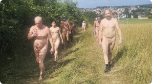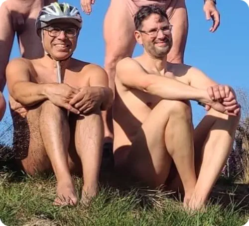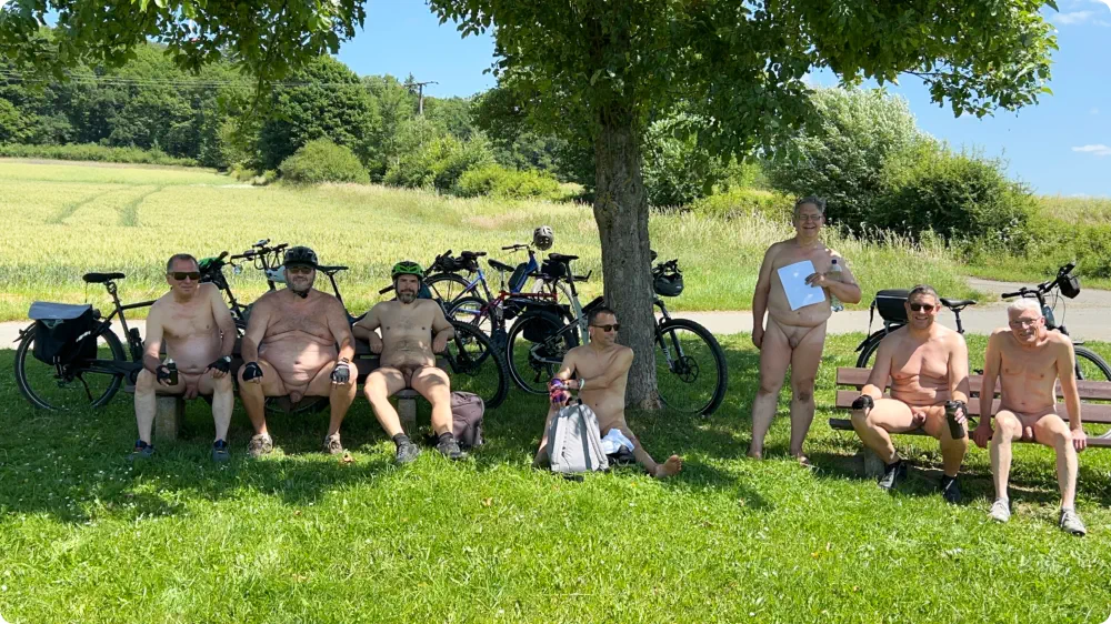 Zeit für einen kurzen Rückblick auf ein wettertechnisch launiges Jahr 2024 Das Frühjahr zeigte sich an den Donnerstagen eher regnerisch und kalt. Zwar begannen wir Anfang Mai die Saison bei schönem Wetter, aber am 23.05. wurden wir zum ersten Mal richtig nass und brachen die Tour sogar ab.Im Juni fielen wieder einige Termine dem wechselhaften Wetter zum Opfer, da ich selber aber mit einer Nierenschiene zu kämpfen hatte, die mit dem Mountainbike auf Kriegsfuß stand, musste ich eh bis Anfang Juli pausieren. Dann war der Stein raus und es konnte wieder gefahren werden.Über den Juli und August konnten wir uns nicht beschweren, die Touren fanden fast alle statt und zusätzlich radelte ich selber auch noch 2-3 mal die Woche nackt durch den Taunus.Zusammen mit Get Naked Germany und dem NB Rhein-Main e.V. hatten wir eine tolle Ausfahrt mit 20 Teilnehmerinnen und Teilnehmern.Insgesamt hat sich die Gruppe prima entwickelt, wir haben tolle Neuzugänge, sehr sympathische Naturisten, die toll in die Gruppe passen.In 2024 waren wir oft mehr als sechs Fahrer, an einem Termin waren wir zu elft.Wir hatten das große Privileg, dass wir einen Journalisten vom Zeit Magazin dabei hatten, Dimitrij Kapitelman und dass uns der tolle Fotograf Nico Schweig begleitete, der hervorragende Bilder von der Gruppe machte und die Atmosphäre sehr gut im Bild festhielt.Alles in allem also eine tolle Saison mit wunderbaren Menschen, die so wie ich sehr zu schätzen wissen, was nackte Aktivitäten in der Natur mit einem machen, welche Wohltat dies für Körper und Seele ist und wie sehr man sich nackt mit der Natur verbunden fühlt, die Wunder der Natur spürt, aber auch deren Verletzlichkeit und ihre Narben und Wunden fühlt.Wir alle sind sehr demütig und dankbar, dass wir in einem Land leben dürfen, in dem man uns mit Freundlichkeit und Toleranz begegnet und wir unserer Passion nachgehen dürfen!Ich persönlich bin sehr dankbar, für die tollen, nackten Momente, die ich in der Gesellschaft solch toller Menschen erleben darf!Ralf